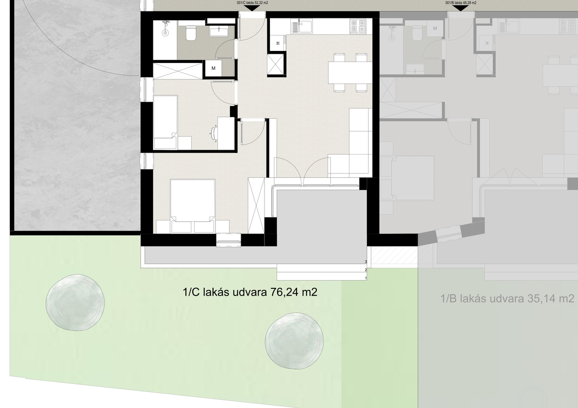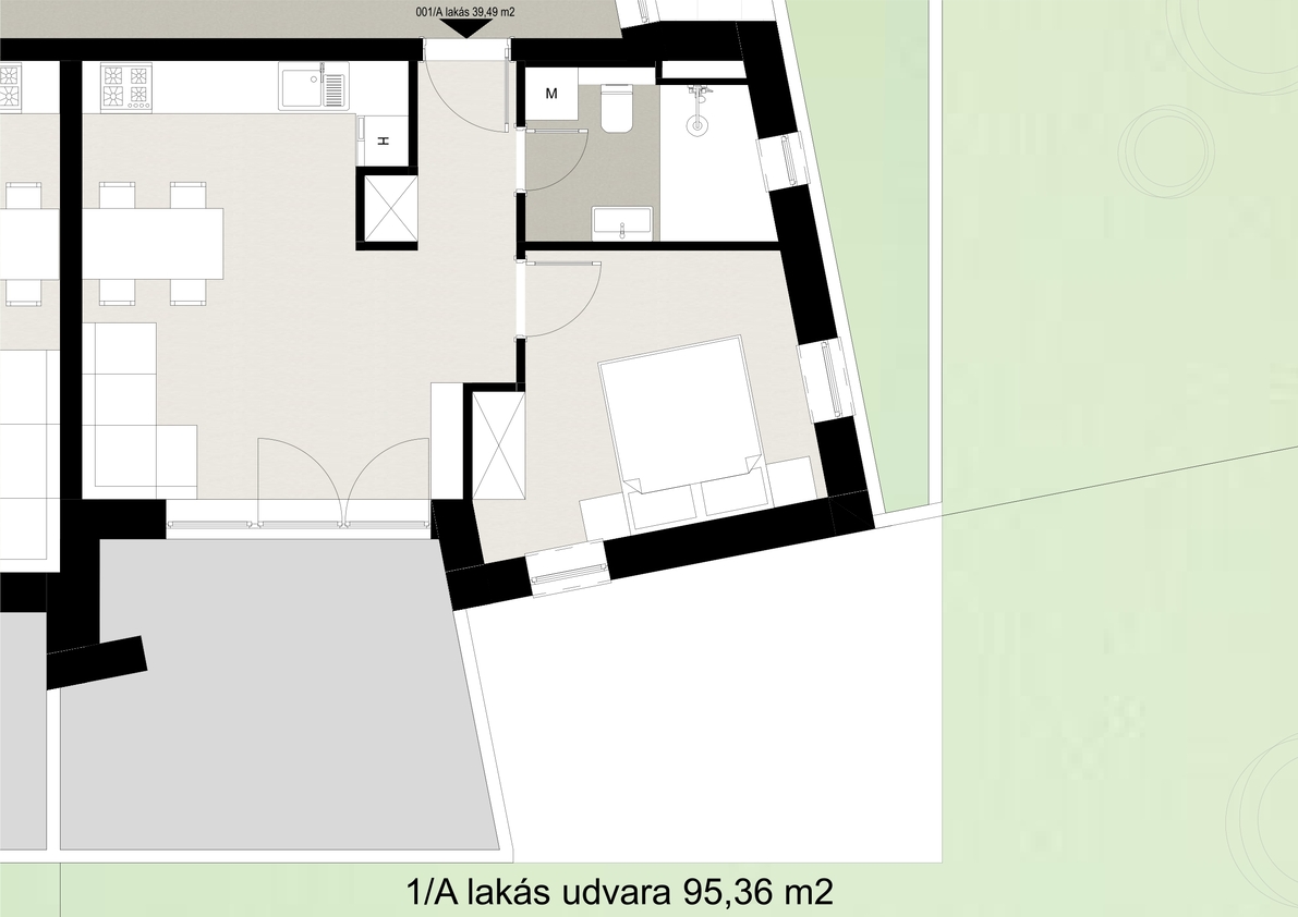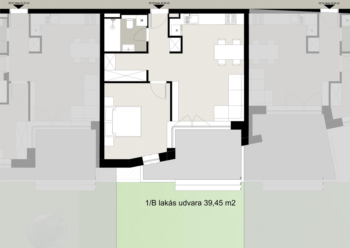 48,28 m2 + 12,08 m2 terasz + 39,45 m2 udvar
