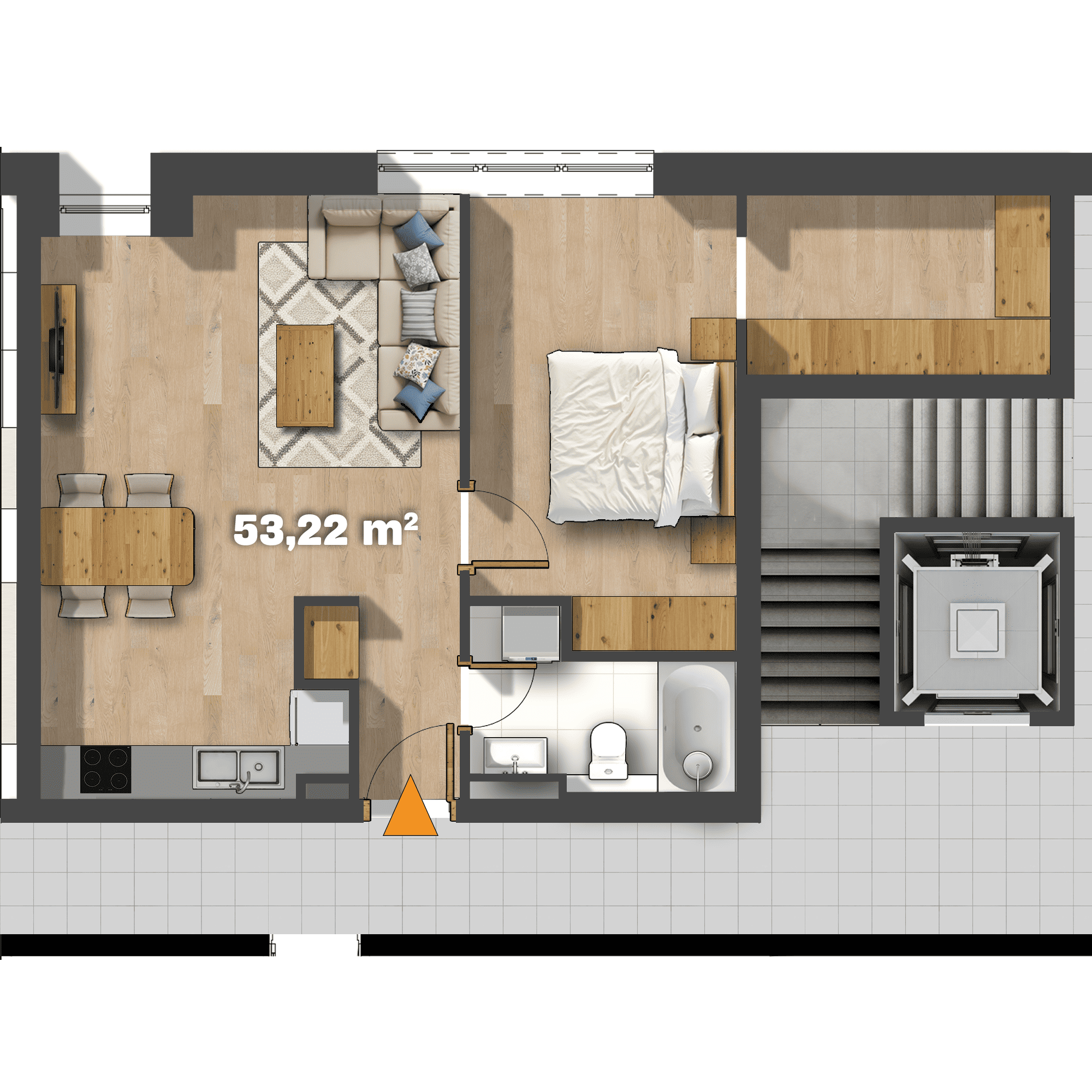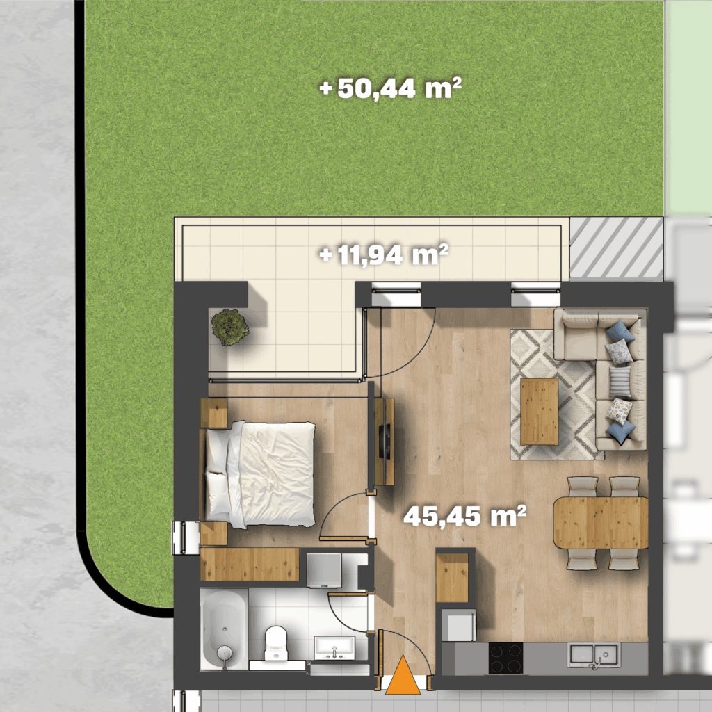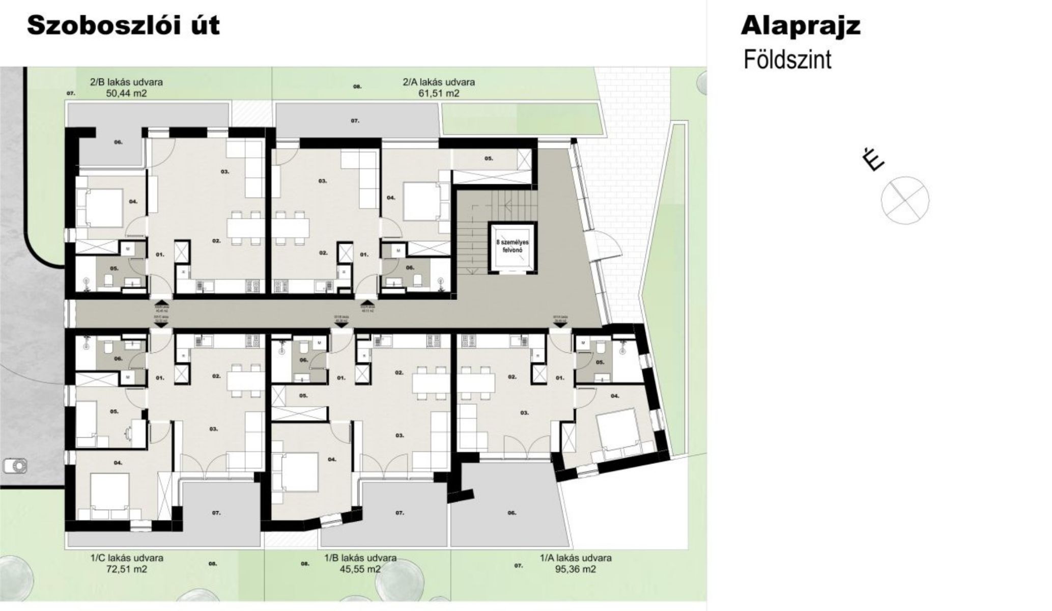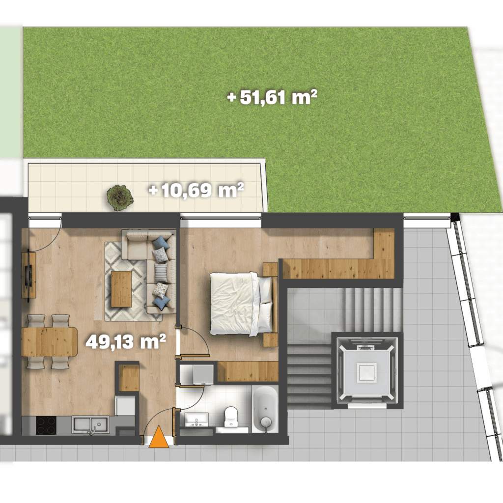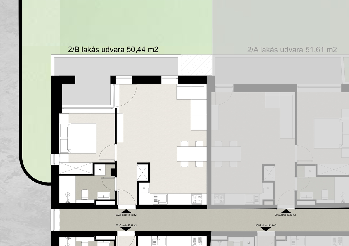 49,13 m2 + 10,62 m2 terasz + 51,61 m2 udvar