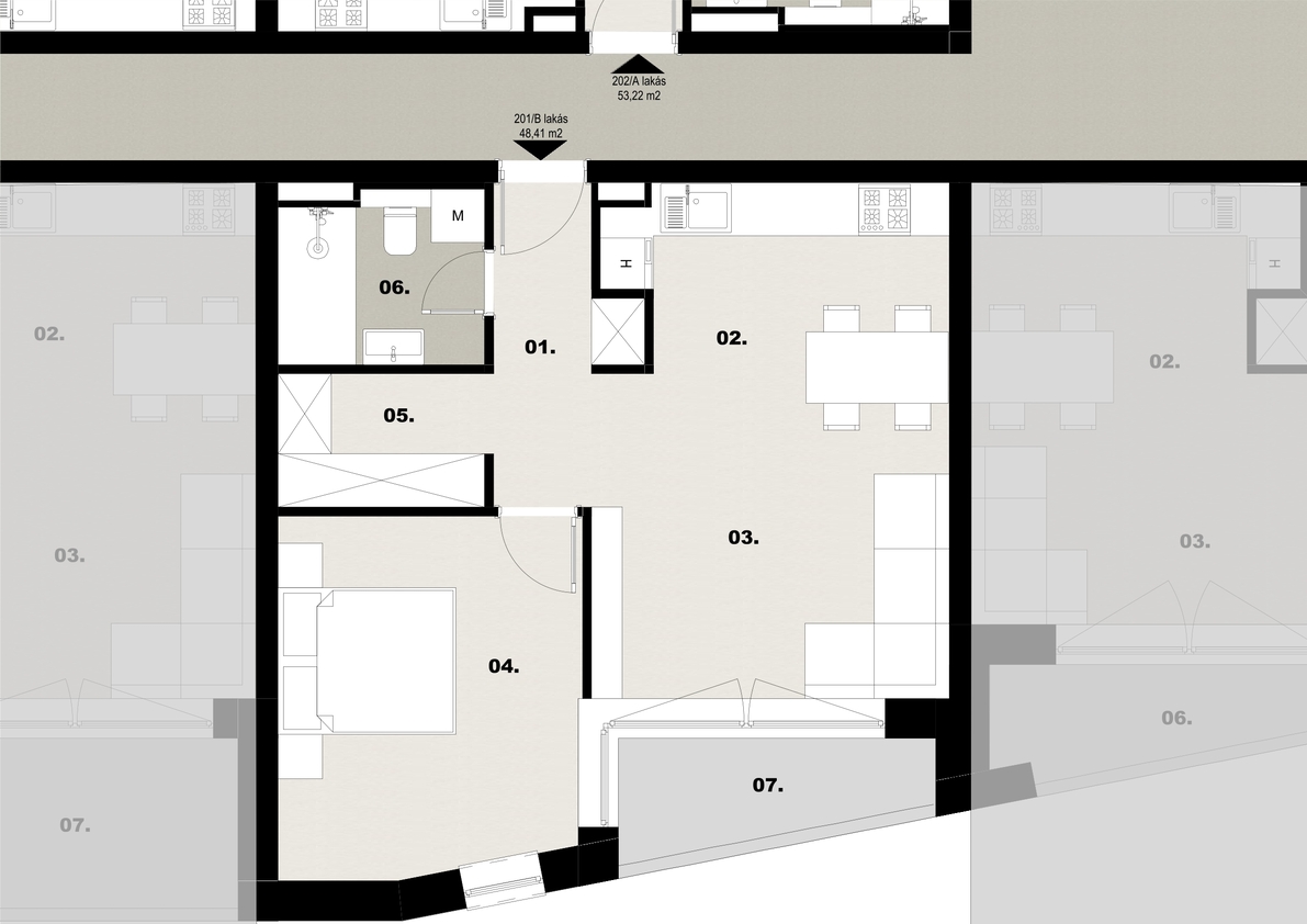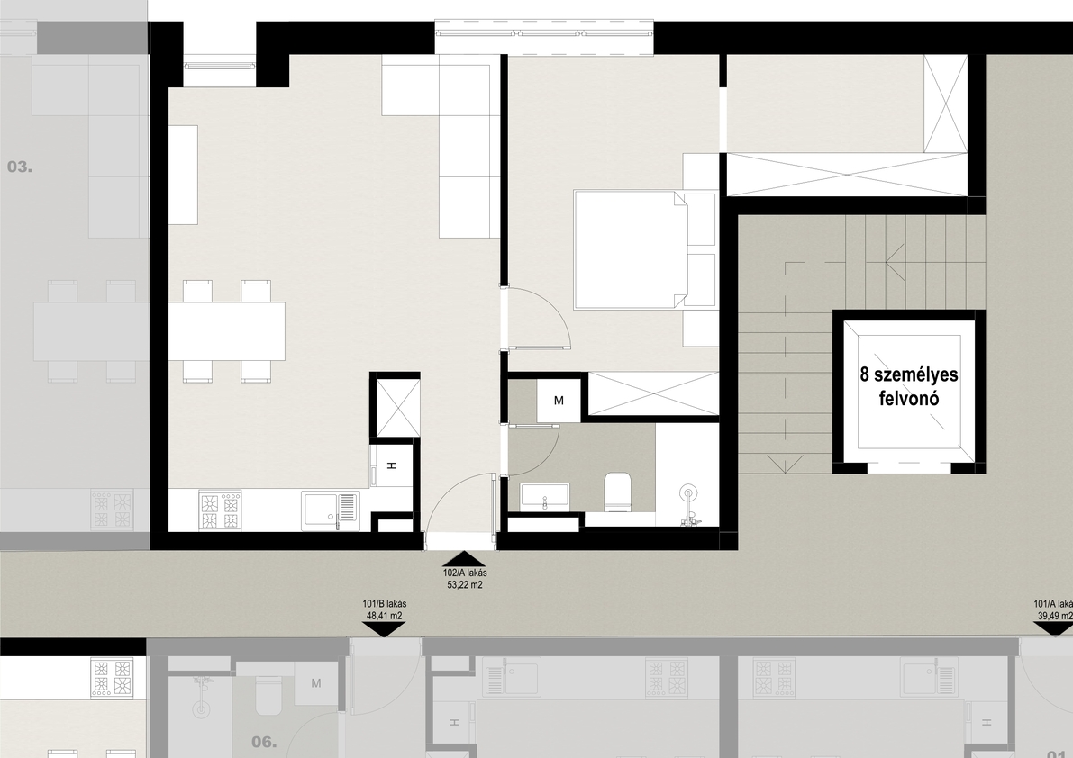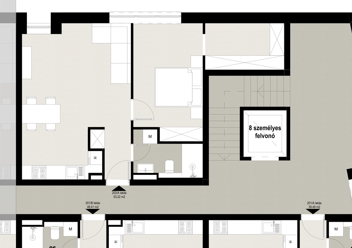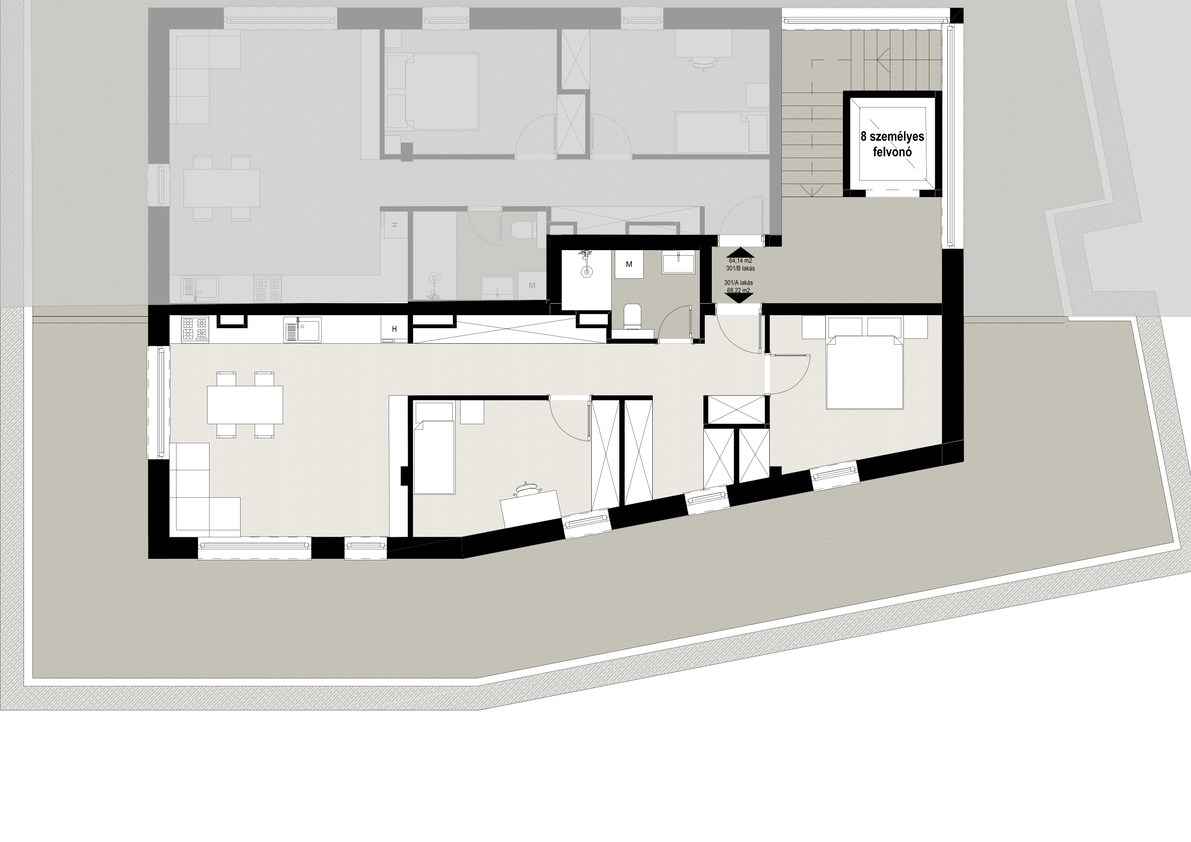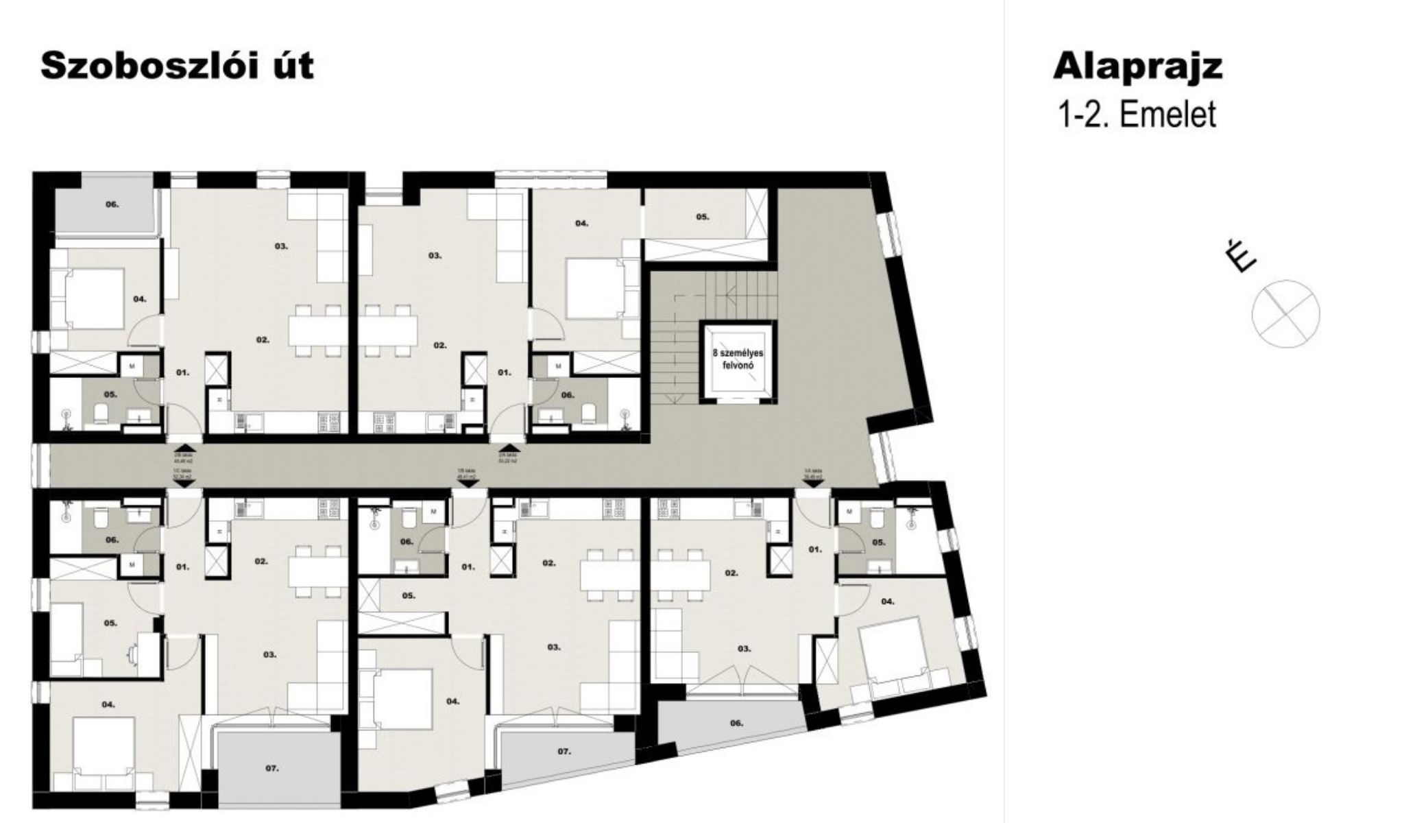 Az épület 5 szintből áll. Mélygarázs, földszint és 3 emelet. A földszinti lakások mindegyike privát kertkapcsolatos. Emeletenként 5-5 lakás, a harmadik emeleten pedig 2 db penthouse lakás található tetőterasszal. A szinteket egy 8 személyes felvonó köti össze. A társasház mélygarázsában 15 db parkoló, és 5 db tároló található, ezek mindegyike külön megvásárolható.