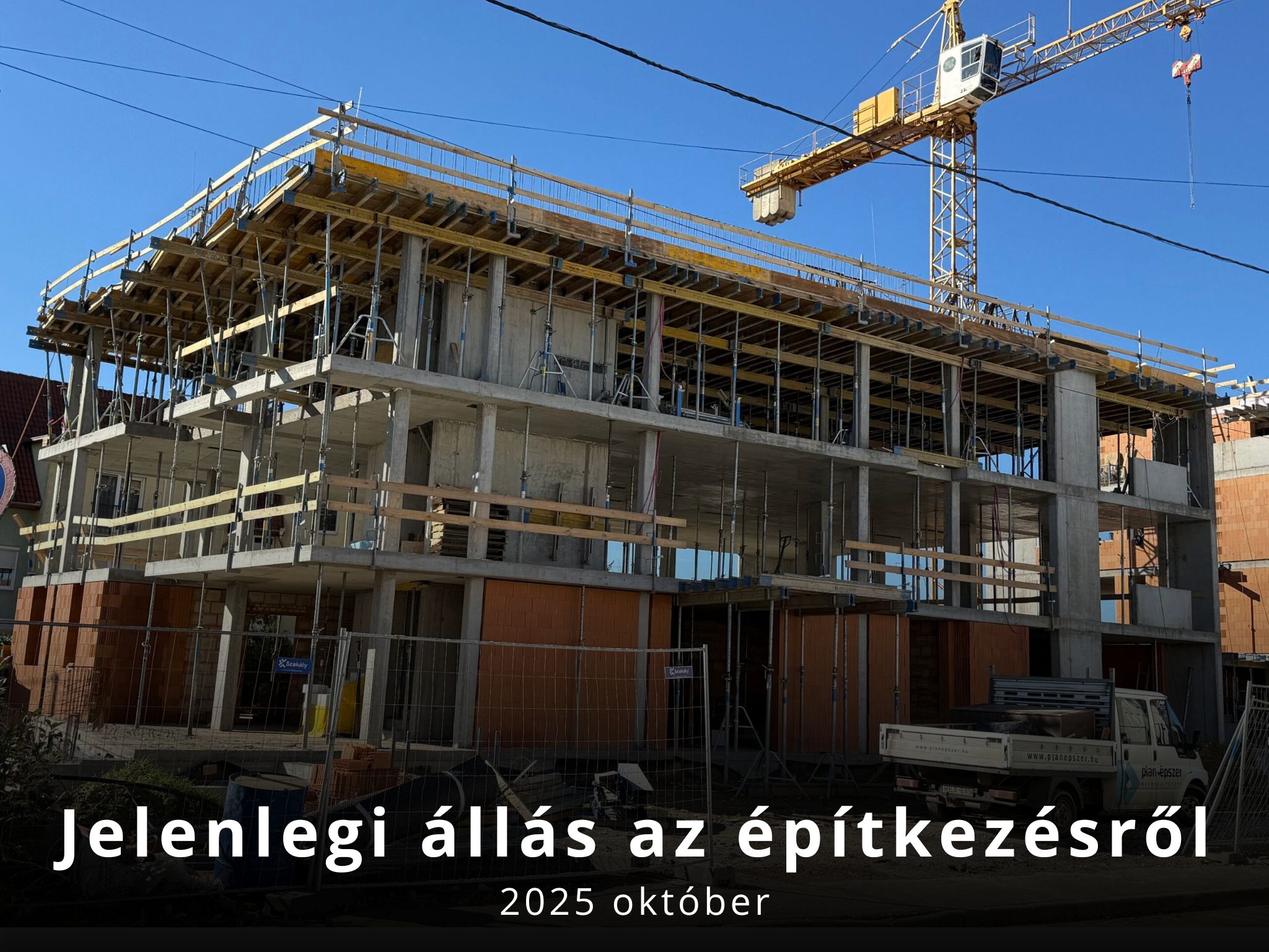 Jelenlegi készültség: 55%. Az építkezés kiváló ütemben halad, így az átadás a tervezett határidő előtt megtörténik.